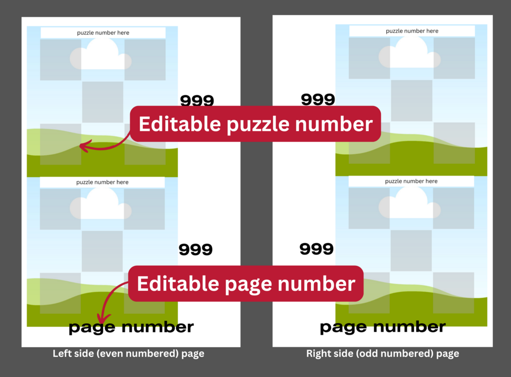 This is what one template pair looks like. You can edit the page and puzzle numbers. Duplicate the pages to create as many as you need for your puzzle book. Remember, the gutter (nearest the spine) is the wide margin. The outside edge is the narrow margin.